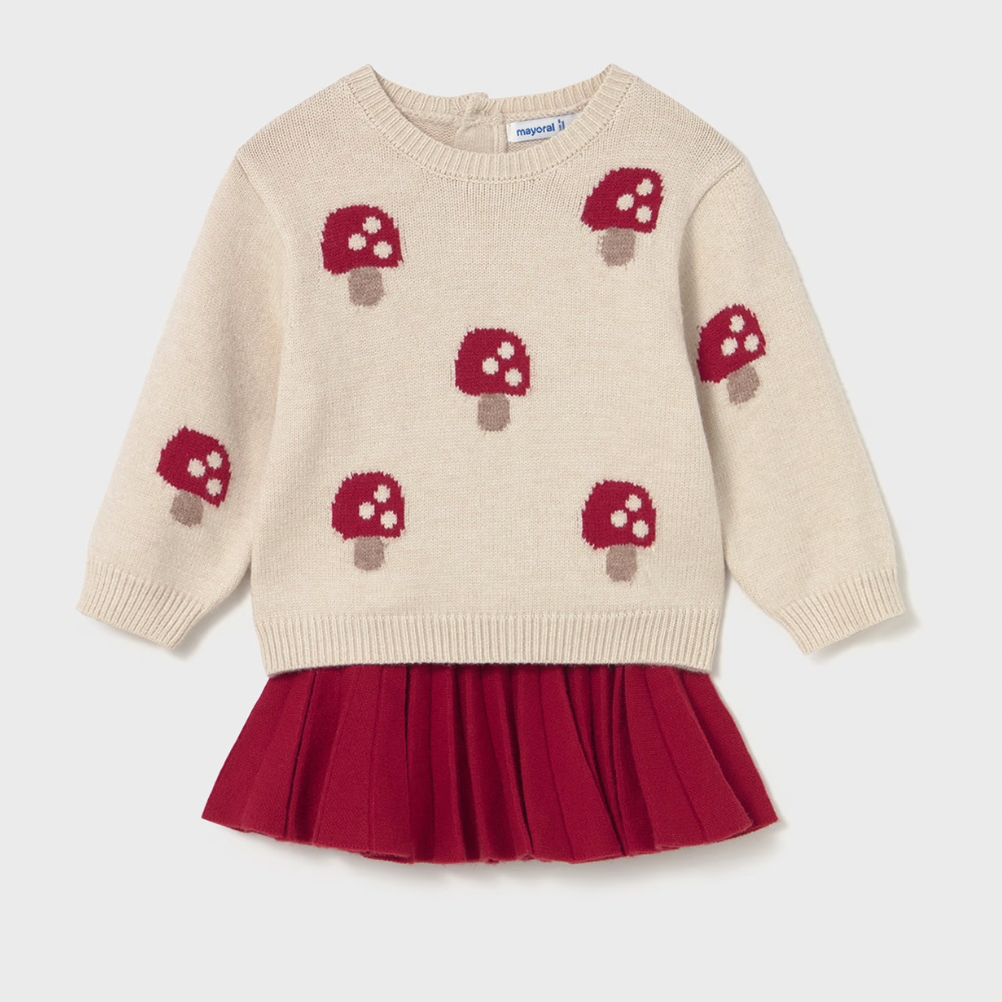 This cozy baby set includes a soft knit sweater and skirt, featuring charming red and white toadstools. Made with recycled polyester, it’s as gentle on the planet as it is on your little one’s skin.